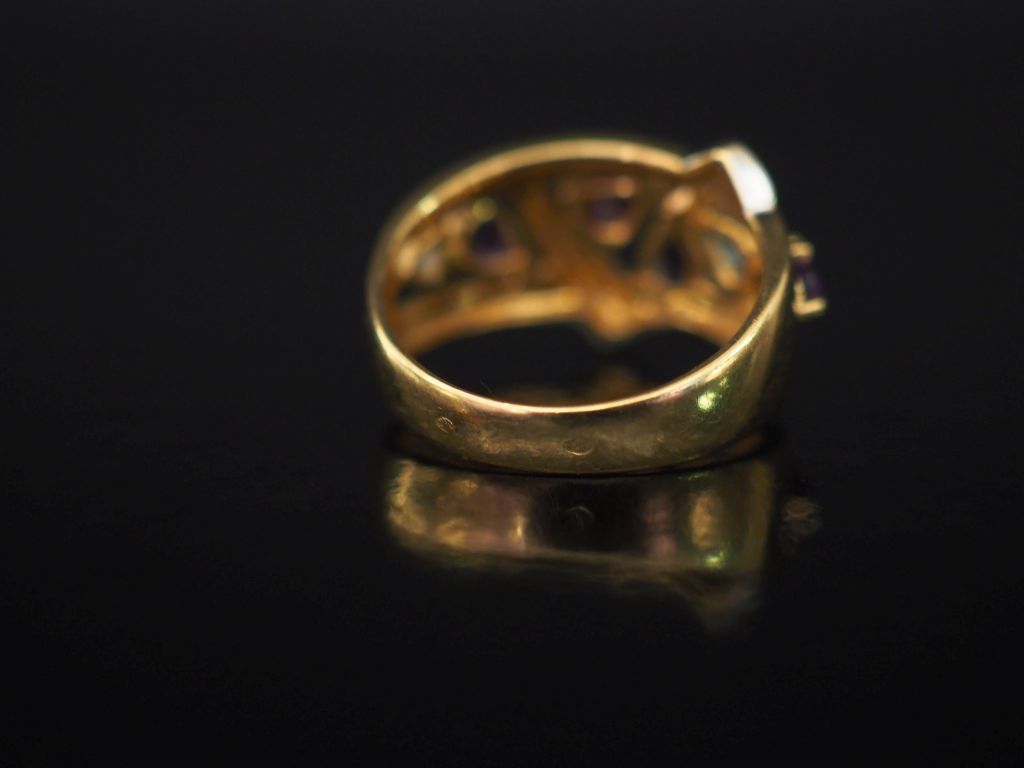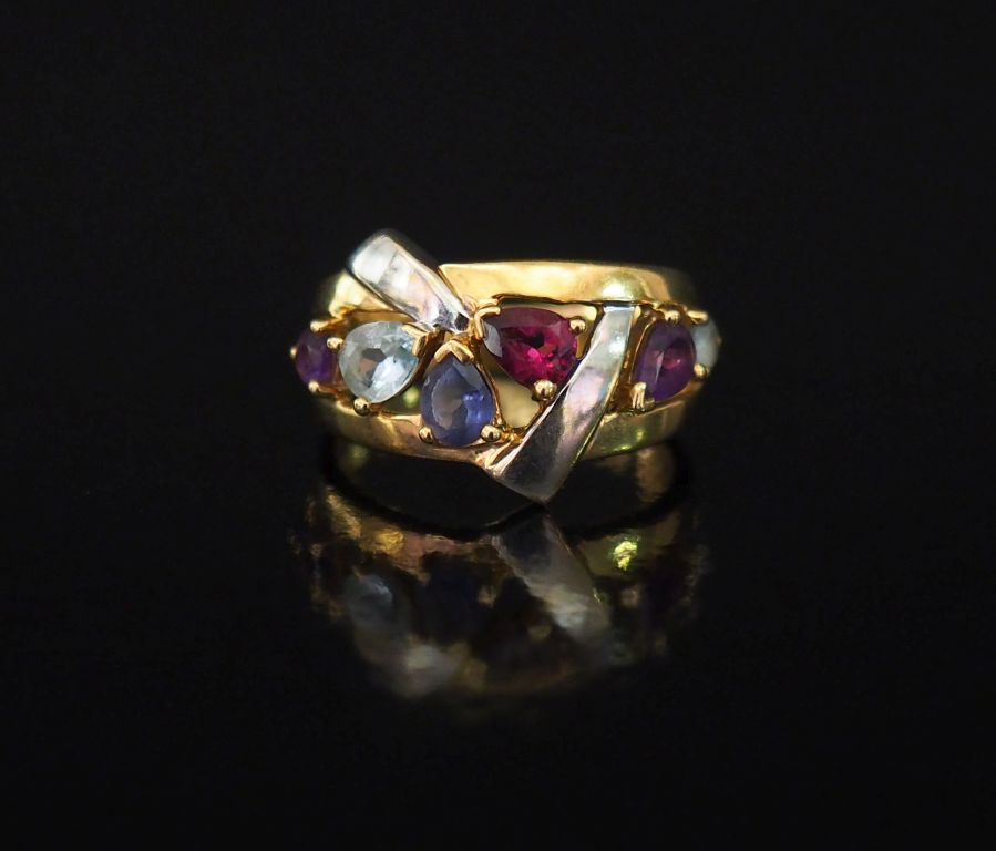 Bague ajourée deux tons d'or de forme stylisée, sertie de pierres de couleur. TDD. 56 Poids tel. 6,22 g