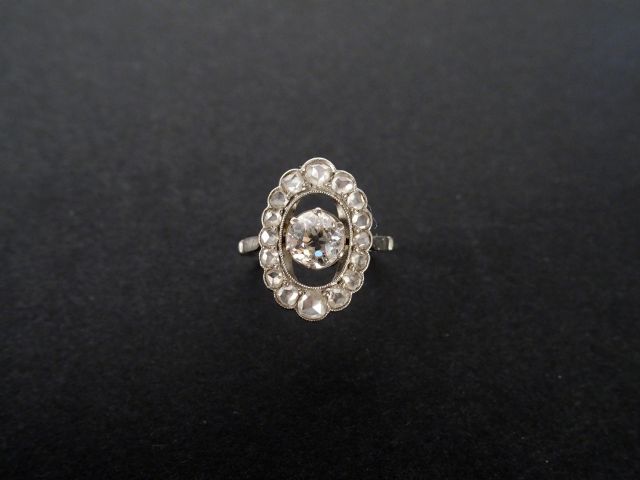 Bague années 20 monture platine, ornée en son centre d'un diamant taille ancienne de 0,55cts environ entourage de roses. TDD 49,5 Poids tel: 3,3gr