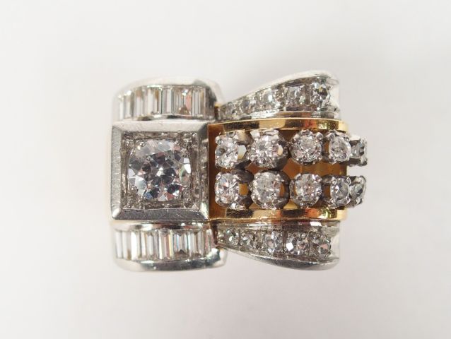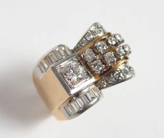 Bague Art déco monture or jaune, ornée d’un diamant taille ancienne de 0,50 ct environ épaulé de 2 lignes de diamants taille baguette, pavage de roses et de 10 diamants taille ancienne entre 0,04ct et 0,06ct environ. TDD 53 Poids tel : 13,4gr