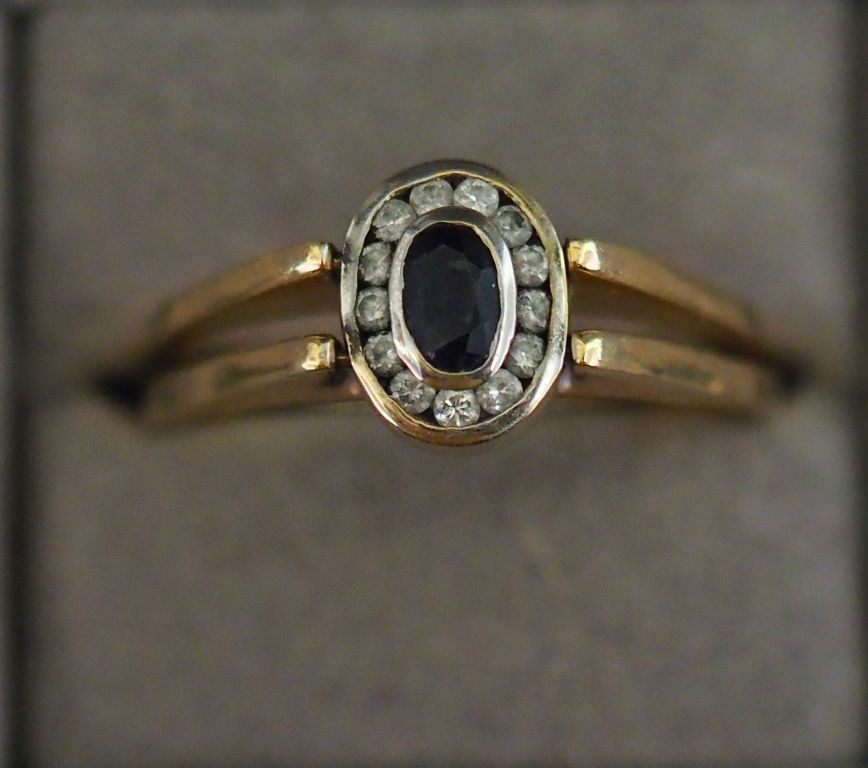 Bague articulée double faces en or jaune 750, sertie d'un côté d'une émeraude entourée de petits diamants et de l'autre d'un saphir entouré de petits également. TDD. 59 Poids tel. 6,27 g