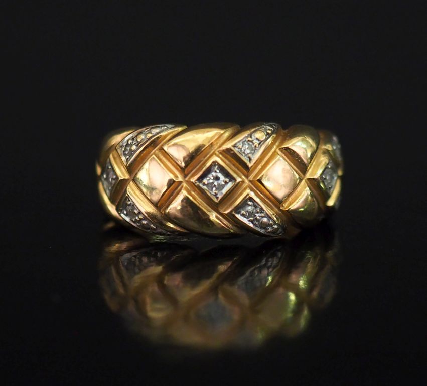Bague bandeau en or jaune 750, à décor quadrillé et sertie de petits diamants. TDD. 54 Poids tel. 6,47 g