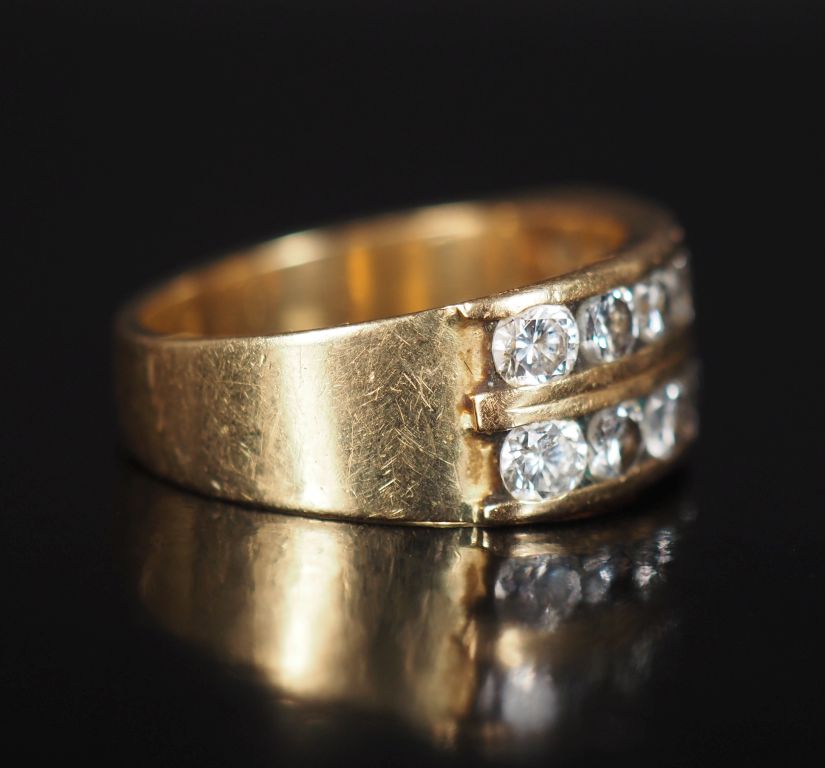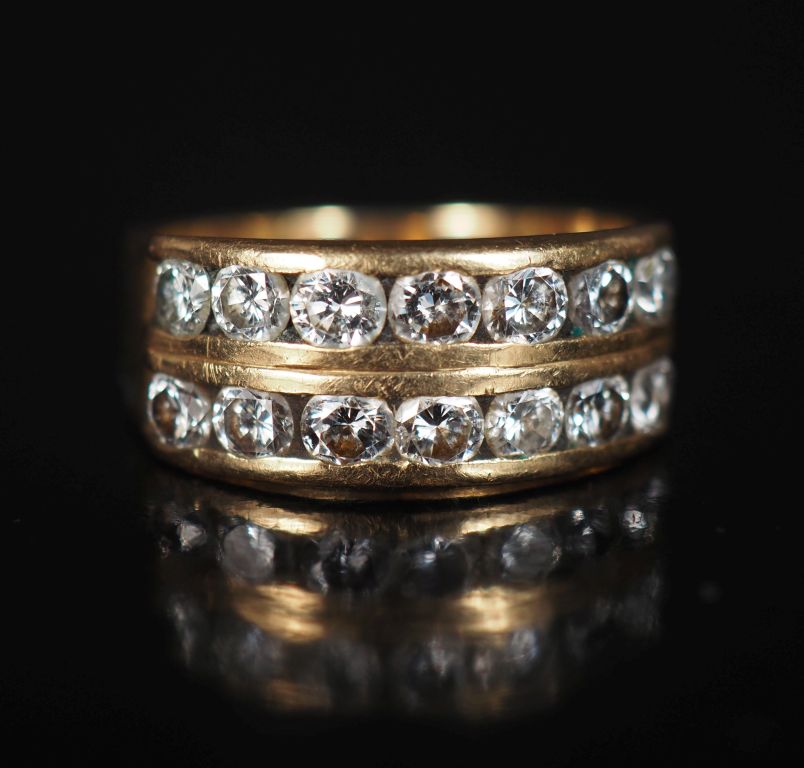 Bague bandeau en or jaune 750, sertie de deux lignes de sept diamants pesant environ 0,1 ct chaque. TDD. 58 1/2 Poids tel. 9,04 g (à charge de contrôle)