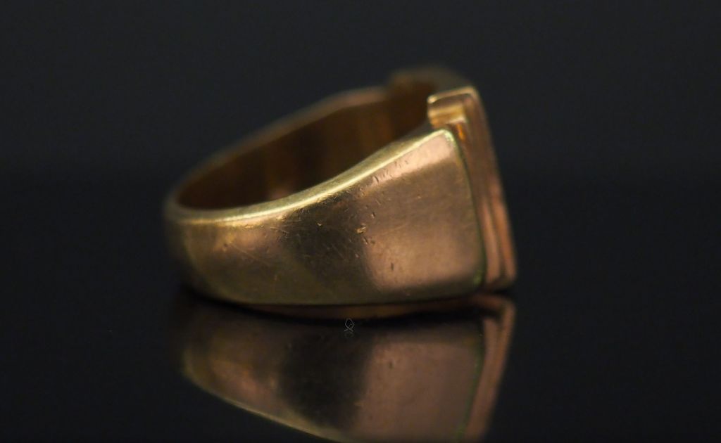 Bague chevalière de femme de style Art déco en or jaune, à décor de monogramme. TDD. 52 Poids. 12,52 g (à charge de contrôle)