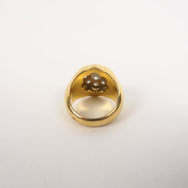 Bague chevalière marguerite en or jaune, ornée d'un diamant central entouré de huit diamants. Poids tel. 19,5 g
