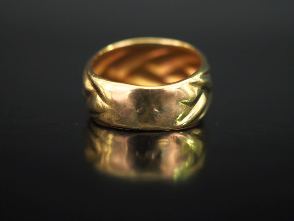 Bague de forme bombée en or jaune 750, à décor de motifs géométriques. TDD. 54 Poids. 2,74 g