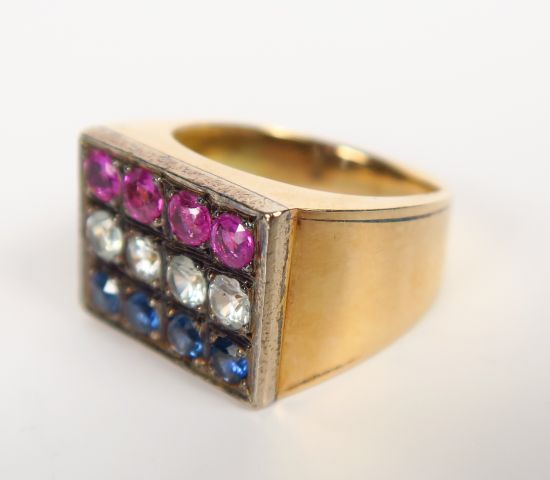 Bague de forme chevalière en or 14 carats sertie de petites pierres de couleur. Poids tel : 6,39 g