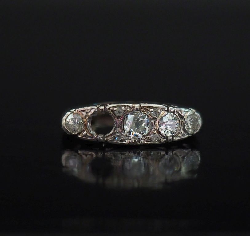 Bague de forme jarretière en or blanc 750, sertie d'une ligne de quatre diamants taille ancienne en chute. TDD. 53 Poids tel. 4,53 g (manque un diamant)