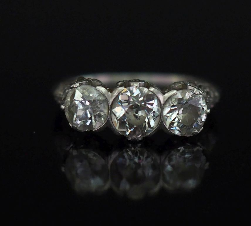Bague de forme jarretière en platine 850, sertie de trois diamants taille anciennepesant environ 0,6 ct pour le diamant central et 0,5 ct environ pour les deux diamants latéraux. Jolie monture ajourée, sertie de petits diamants. TDD. 56 Poids tel. 4,31 g