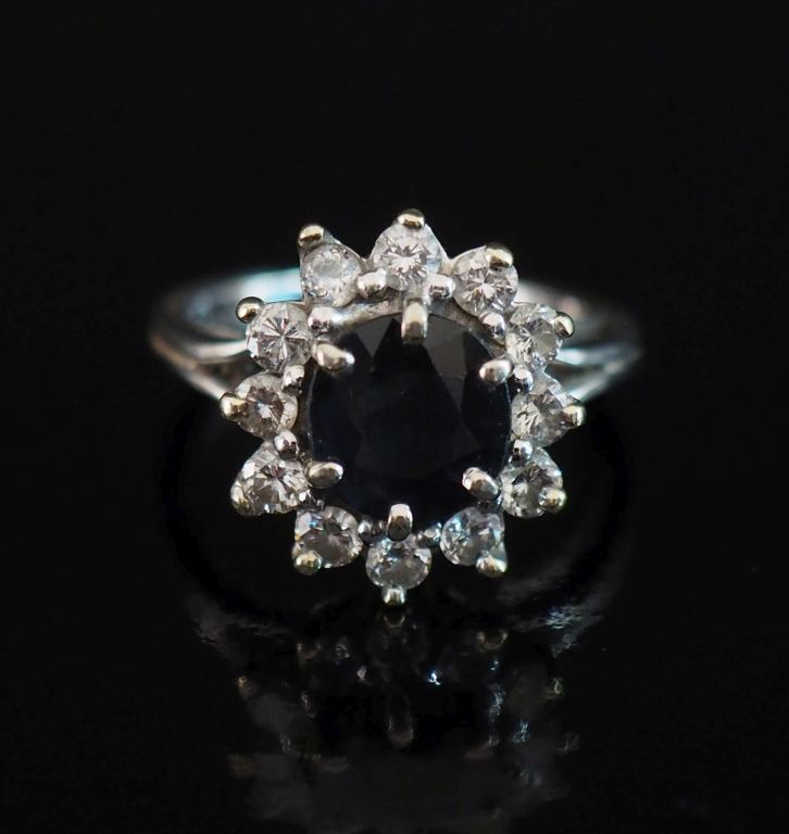 Bague de forme marguerite en or blanc 750, sertie en son centre d'un pierre bleue et entourée d'une couronne de onze petits diamants. TDD. Poids tel. 5,07 g (une pierre à l'imitation du diamant)