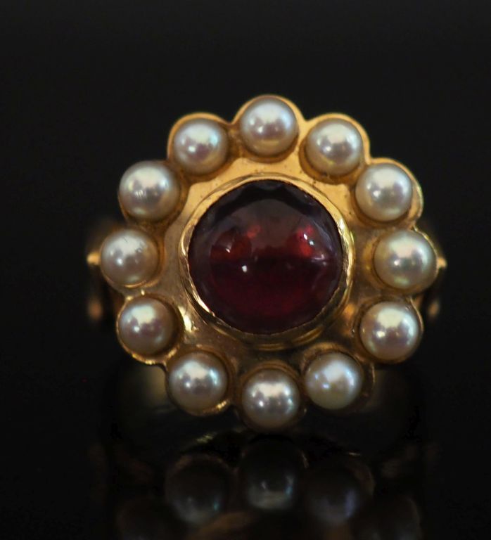 Bague de forme marguerite en or jaune 750, sertie en son centre d'une pierre de couleur en cabochon entourée d'une couronne de douze petites perles blanches. Jolie monture, à décor de part et d'autre de motifs d'enroulements. TDD. 55 Poids tel. 10,67 g