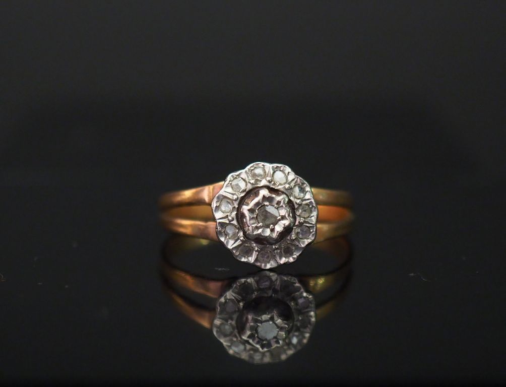 Bague de forme marguerite en or jaune, sertie de petits éclats de diamant. TDD. 56 Poids tel. 2,40 g