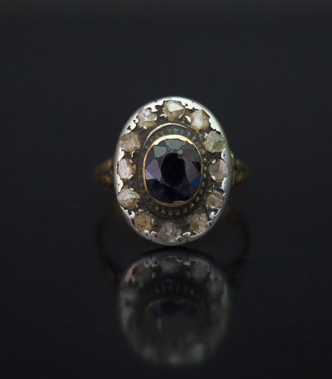 Bague de forme marguerite en or jaune, sertie d’une pierre bleue entourée de douze diamants taillés en rose. TDD. 52 Poids tel. 4,25 g (petites usures à la pierre)