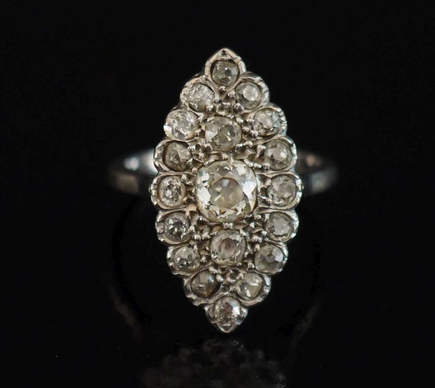 Bague de forme marquise en or blanc 750, sertie d'un pavage de diamants taillés en rose. Le diamant central pesant environ 0,2 ct. TDD. 54 Poids tel. 5,78 g