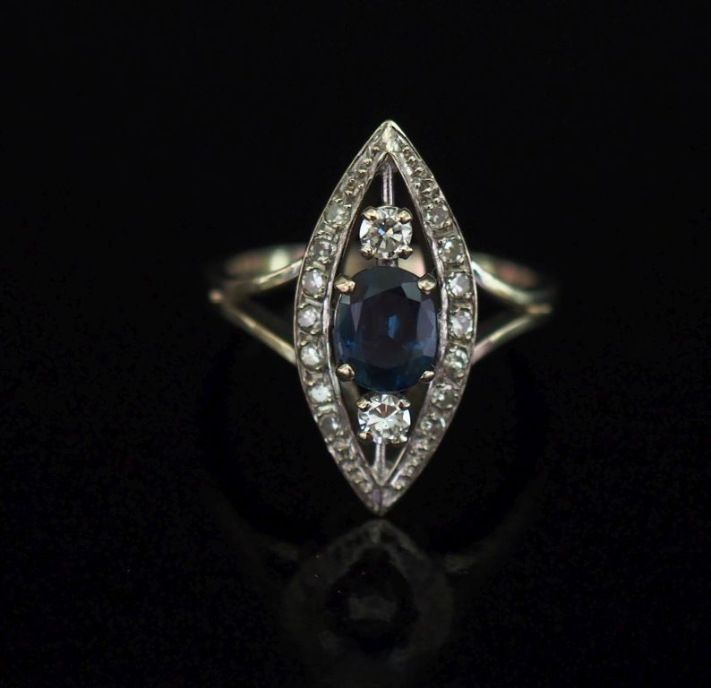 Bague de forme marquise en or blanc 750, sertie en son centre d’une pierre bleue épaulée de deux petit diamant. Le pourtour agrémenté de petits diamants. TDD. 56 Poids tel. 5,03 g