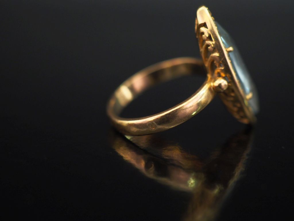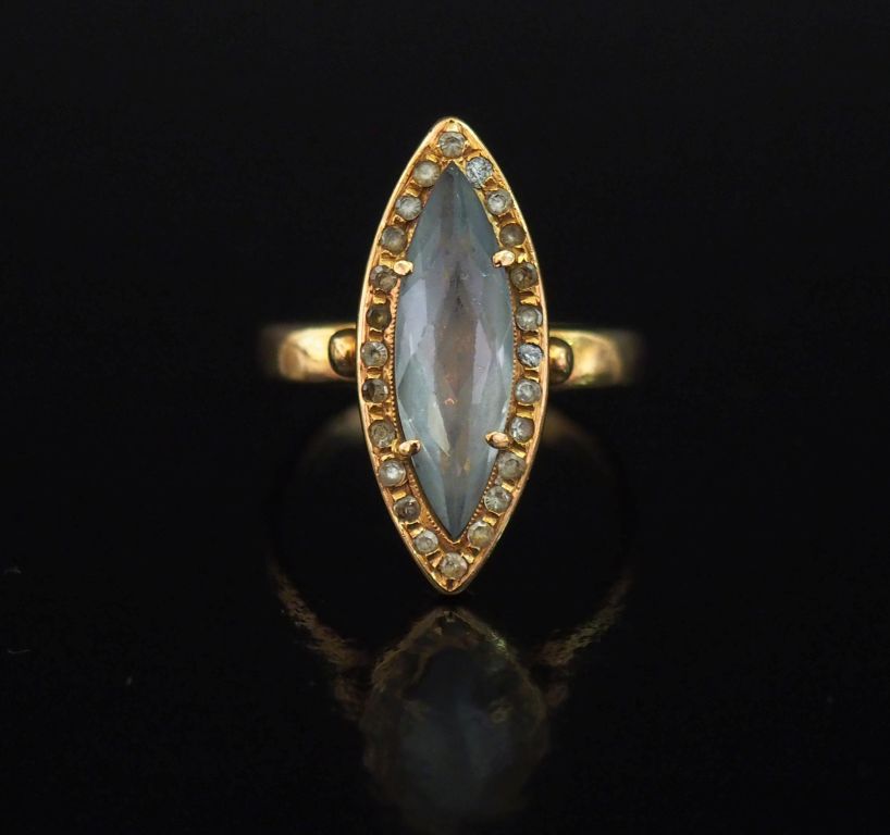 Bague de forme marquise en or jaune 750, sertie en son centre d'une pierre bleue de forme navette entourée d'une couronne de petites pierres bleues. TDD. 57 Poids tel. 5,78 g