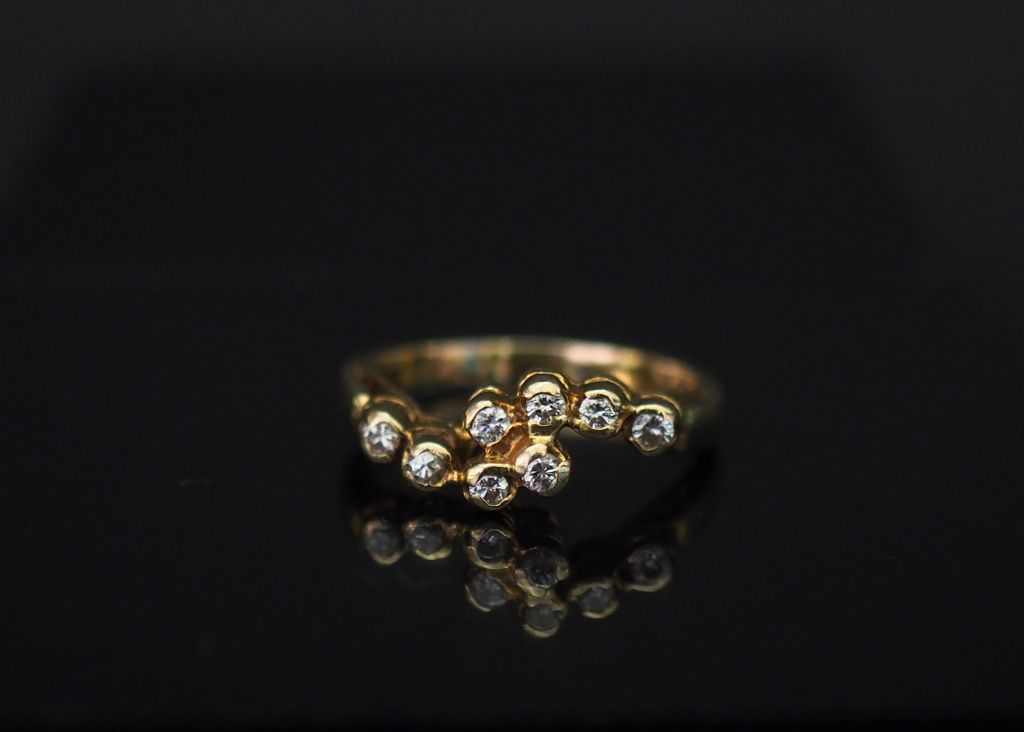 Bague de forme mouvementée en or jaune 14k, sertie de huit petits diamants. TDD. 51 Poids tel. 3,23 g
