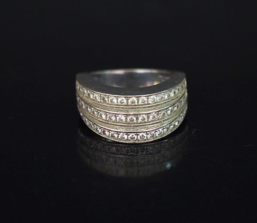 Bague de forme stylisée en or blanc, composée de trois anneaux accolés et montés en escalier, sertis de petits diamants. TDD. 53 Poids tel. 11,84 g