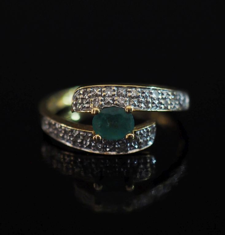 Bague de forme stylisée en or jaune 750, sertie en son centre d'une émeraude. Monture de forme mouvementée agrémentée de quatre lignes de petits diamants. TDD. 55 Poids tel. 2,75 g