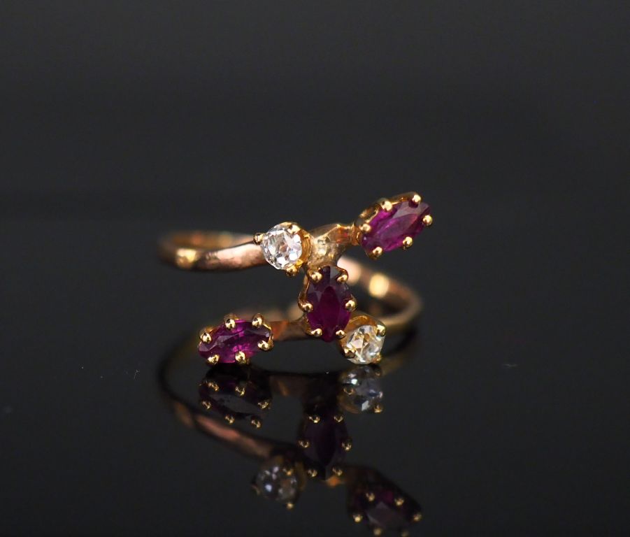 Bague de forme stylisée en or jaune, sertie de trois grenats et deux petits diamants. TDD. 51 Poids tel. 1,93 g