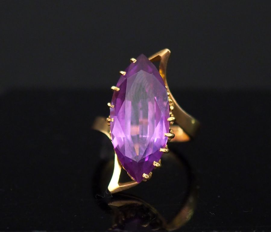 Bague de forme stylisée en or jaune, sertie d’une améthyste. Jolie monture mouvementée. TDD. 49 Poids tel. 7,39 g