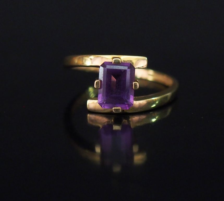 Lot de Bague de forme stylisée en or jaune, sertie d'une pierre mauve. TDD. 6 au prix de 70 à 100 € en vente aux enchères par l'hôtel des ventes Primardeco
