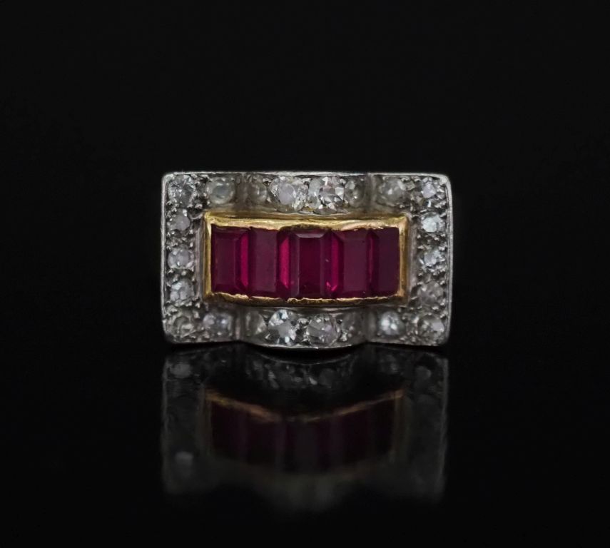 Bague de style 1940 en or jaune 750 de forme mouvementée, sertie de petits diamants et d'une ligne de petits rubis calibrés en son centre. TDD. 62 Poids tel. 6,16 g
