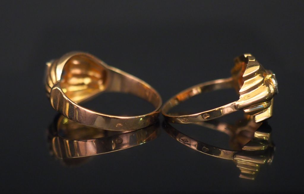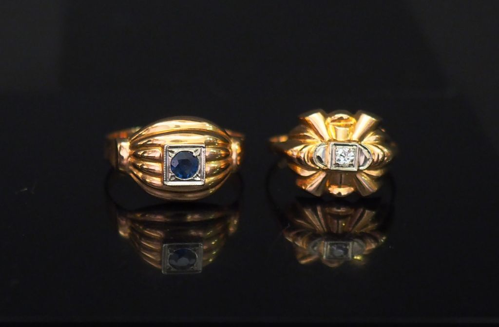 Bague de style 1940 en or jaune, sertie en son centre d'un petit diamant. TDD. 52 Poids tel. 1,39 g On y joint une une bague dôme en or jaune, à décor de godrons et sertie en son centre d'une pierre bleue. TDD. 56 Poids tel. 2,12 g
