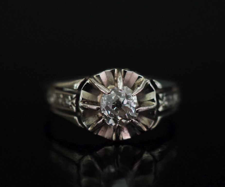 Bague de style Art déco en or blanc 750, sertie en son centre d'un diamant de 0,2 ct environ. Jolie monture ajourée, agrémentée de six petits diamants. TDD. 49 Poids tel. 3,22 g