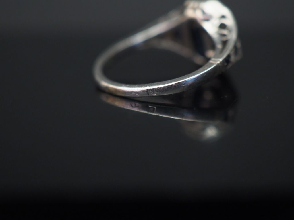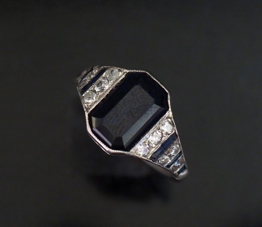 Bague de style Art déco en or blanc, sertie en son centre d'un saphir épaulé de lignes de petits diamants et saphirs calibrés alternées et en chute. TDD. 48 Poids tel. 4,12 g