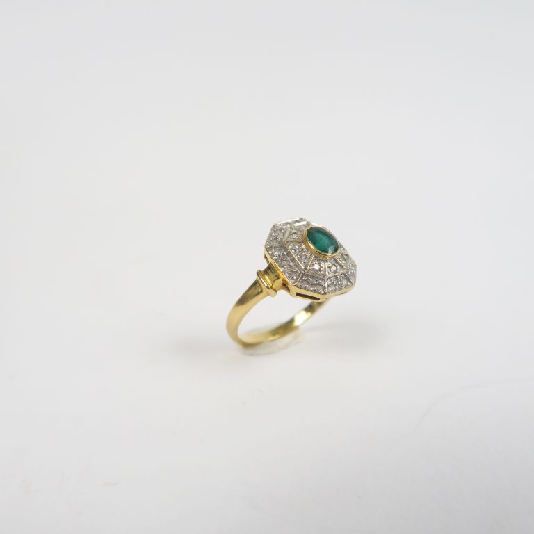 Bague de style Art déco en or jaune, ornée de petites roses et d'une émeraude. Poids. 3 g