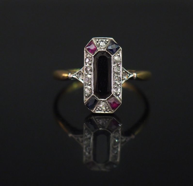 Bague de style Art déco en or jaune, sertie en son centre d'onyx noir entouré d'une couronne de petits éclats de diamants. Les angles sertis de pierres roses et bleues. TDD. 55 Poids tel. 2,47 g (petit accident à une pierre)