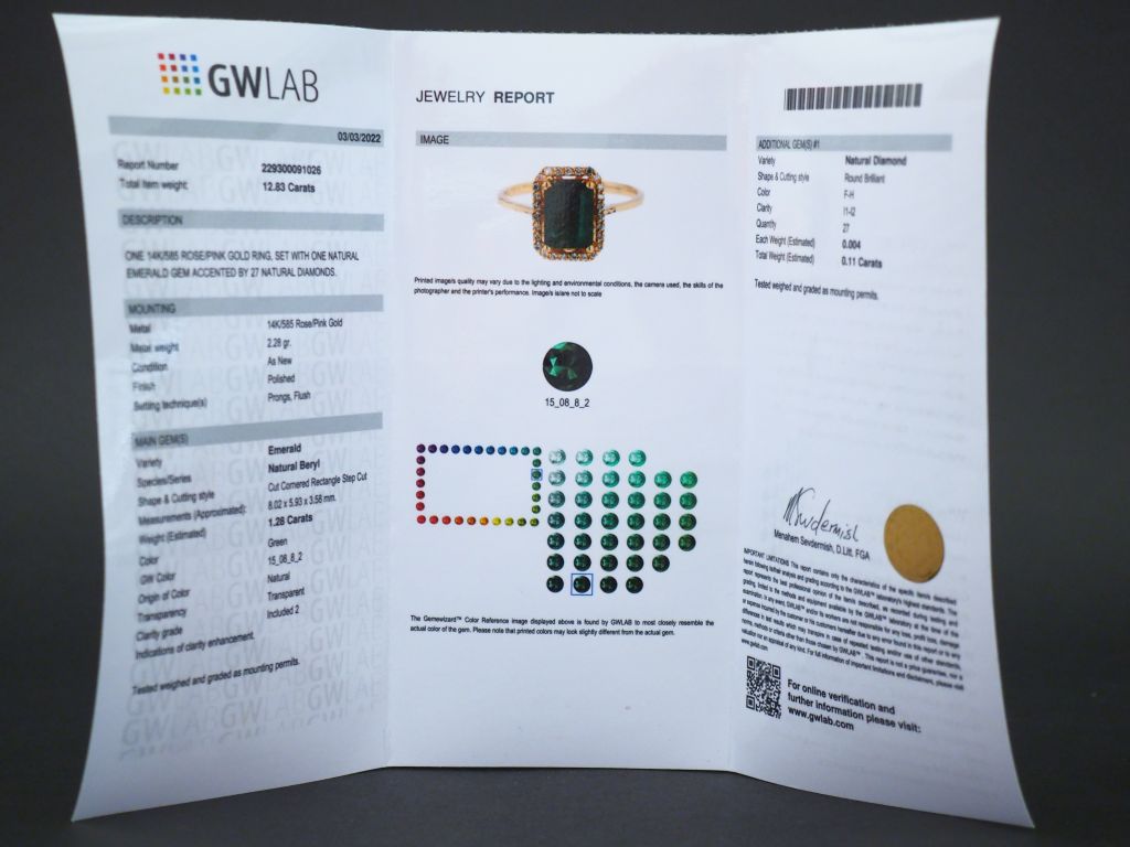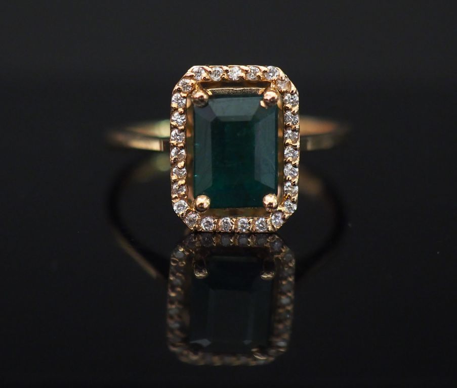 Bague de style Art déco en or rose 14k, sertie en son centre d’une émeraude entourée de vingt-sept petits diamants. TDD. 54 Poids tel. 2,56 g Avec son certificat.
