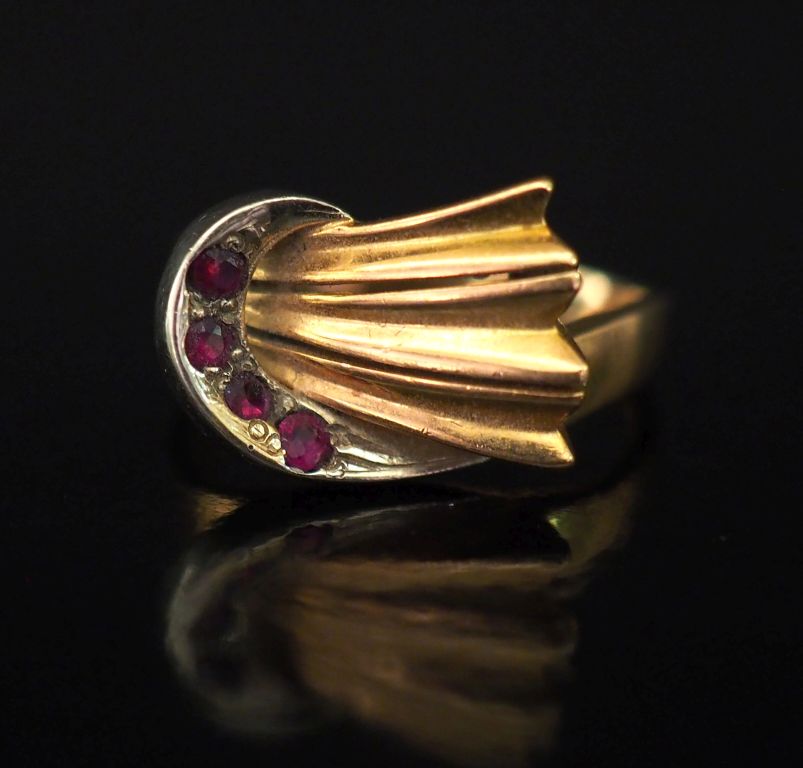 Lot de Bague deux tons d'or, de forme ruban, sertie de trois pierres rouges. au prix de 150 à 200 € en vente aux enchères par l'hôtel des ventes Primardeco