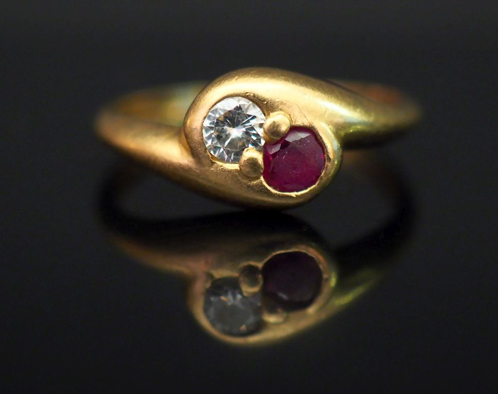 Bague dite « Toi Moi » en or jaune, sertie d’un diamant et d’un rubis. TDD. 52 Poids tel. 2,17 g