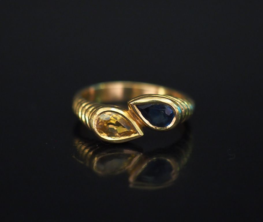 Bague dite "Toi Moi" en or jaune, sertie d'une pierre bleu et d'une pierre jaune en forme de gouttes. La monture agrémentée de godrons. TDD. 50 Poids tel. 3,82 g