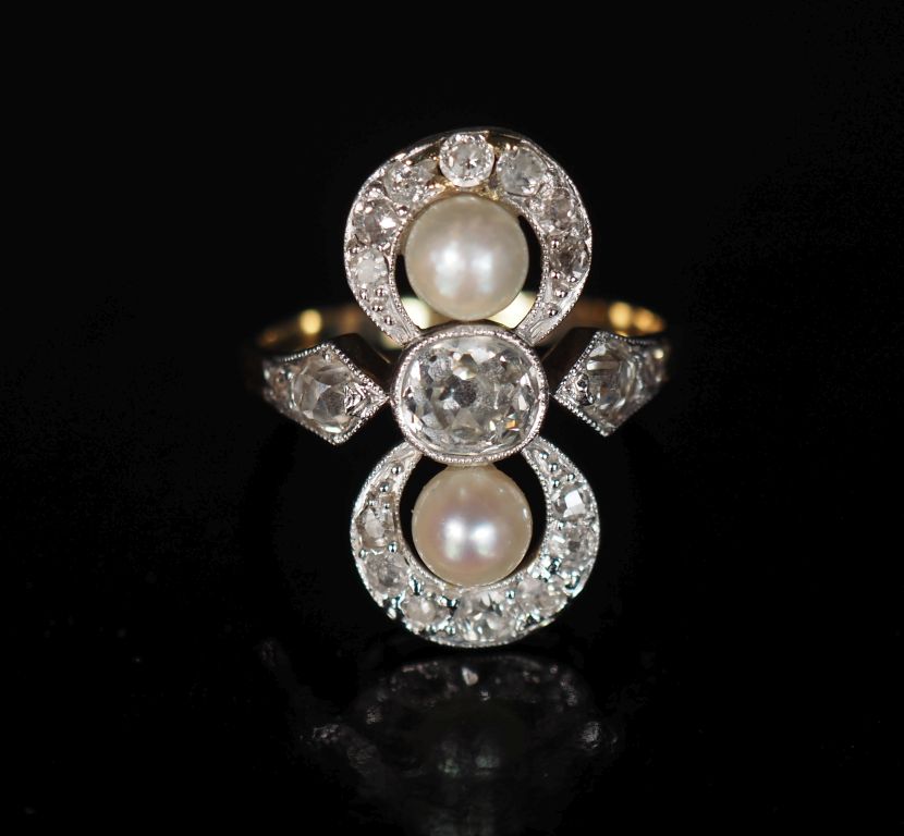 Bague dite "Toi Moi" en or jaune, sertie en son centre d'un diamant taille ancienne épaulé de deux petites perles blanches. Joli pourtour ajouré, serti de petits diamants. La monture agrémentée de part et d'autre de quatre petits diamants. TDD. 55 Poids tel. 4,56 g (à charge de contrôle)