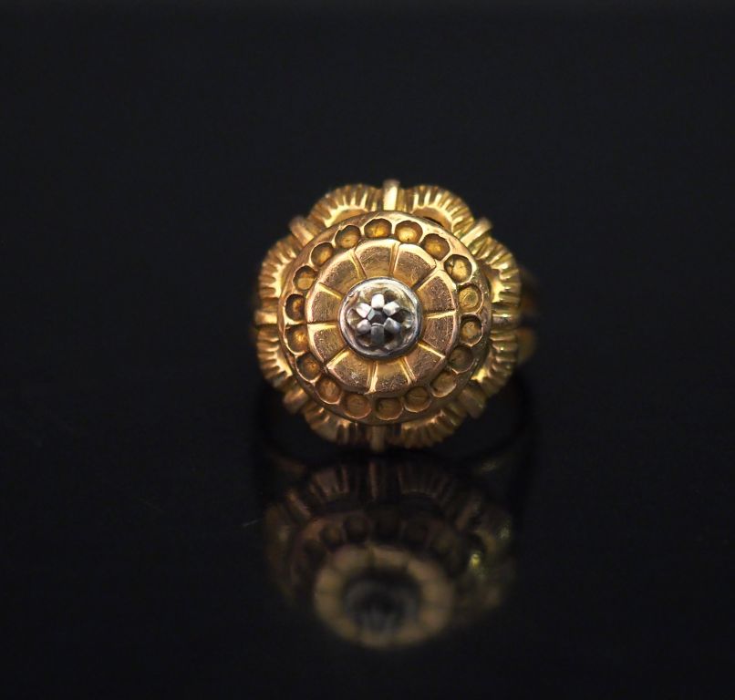 Bague dôme en forme de fleur en or jaune, sertie en son centre d’un petit éclat de diamant. TDD. 53 Poids tel. 5,99 g