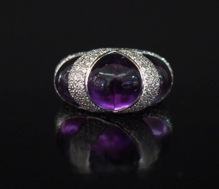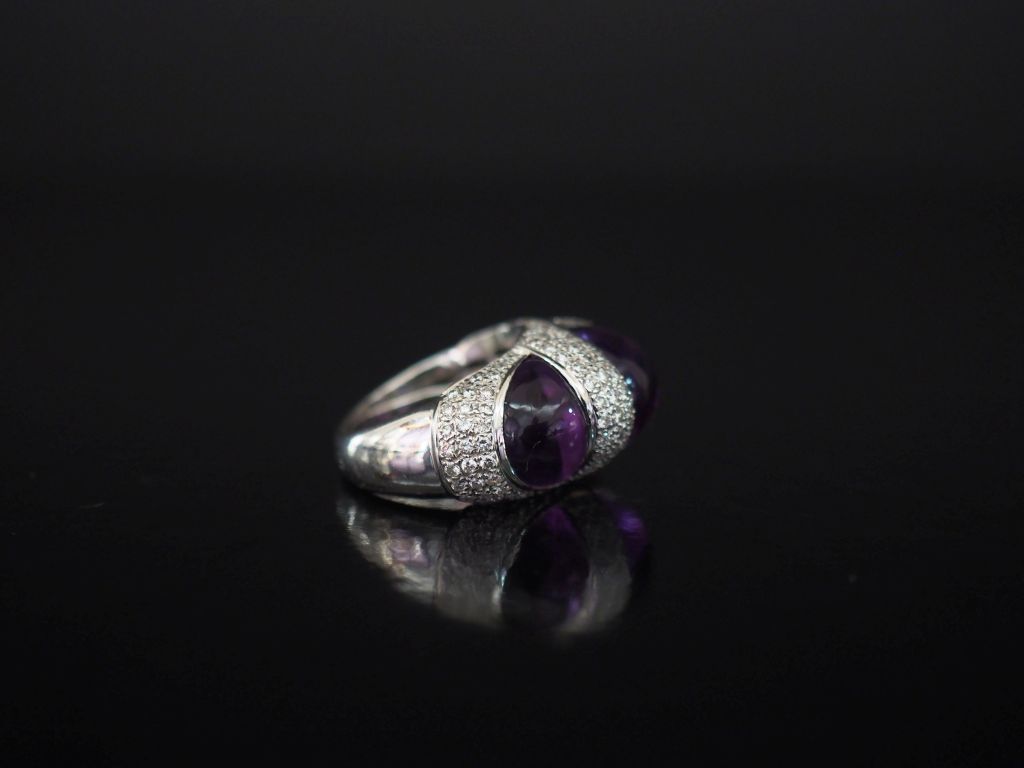 Bague dôme en or blanc, à décor de quartz violets et pavage de petits diamants alternés. TDD. 47 Poids tel. 13,10 g