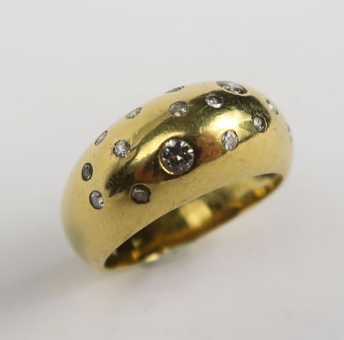 Bague dôme en or jaune, serties de diamants. (un petit remplacé par une imitation). Poids tel : 6,9 g tel