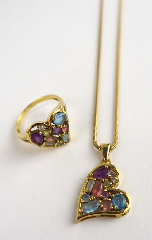Bague en forme de cœur en or et pierres de couleurs, et son collier et pendentif assorti. Poids tel. 8g