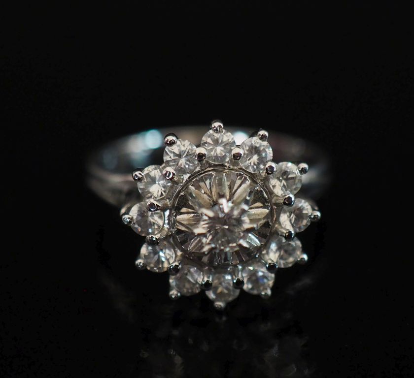 Bague en forme de fleur en or blanc 750, sertie de pierres à l'imitation du diamant. TDD. 53 1/2 Poids tel. 3,90 g
