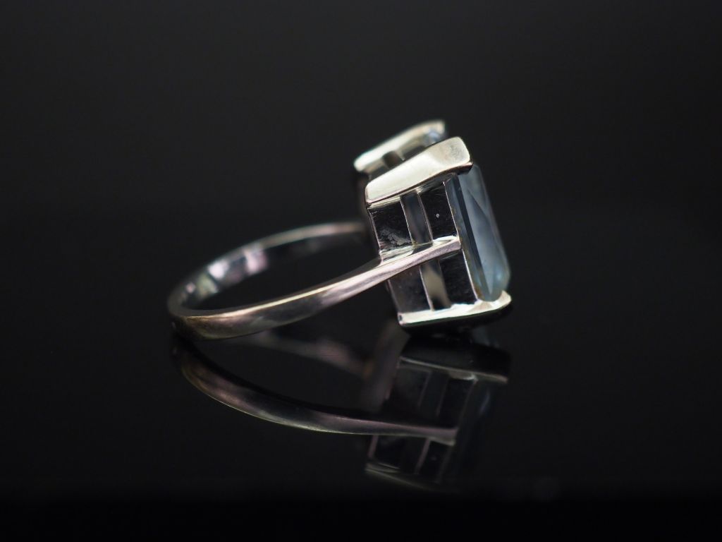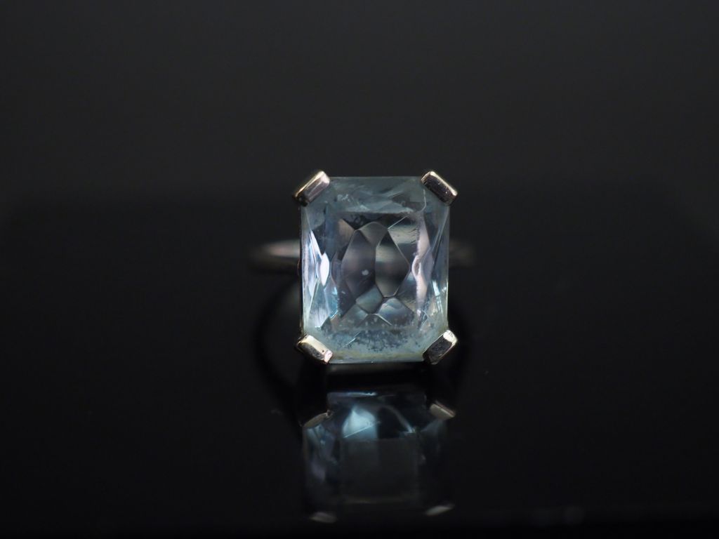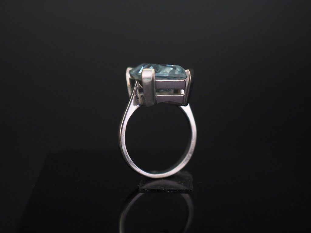 Bague en or banc, sertie en son centre d’une pierre bleue. TDD. 52 Poids tel. 6,59 g