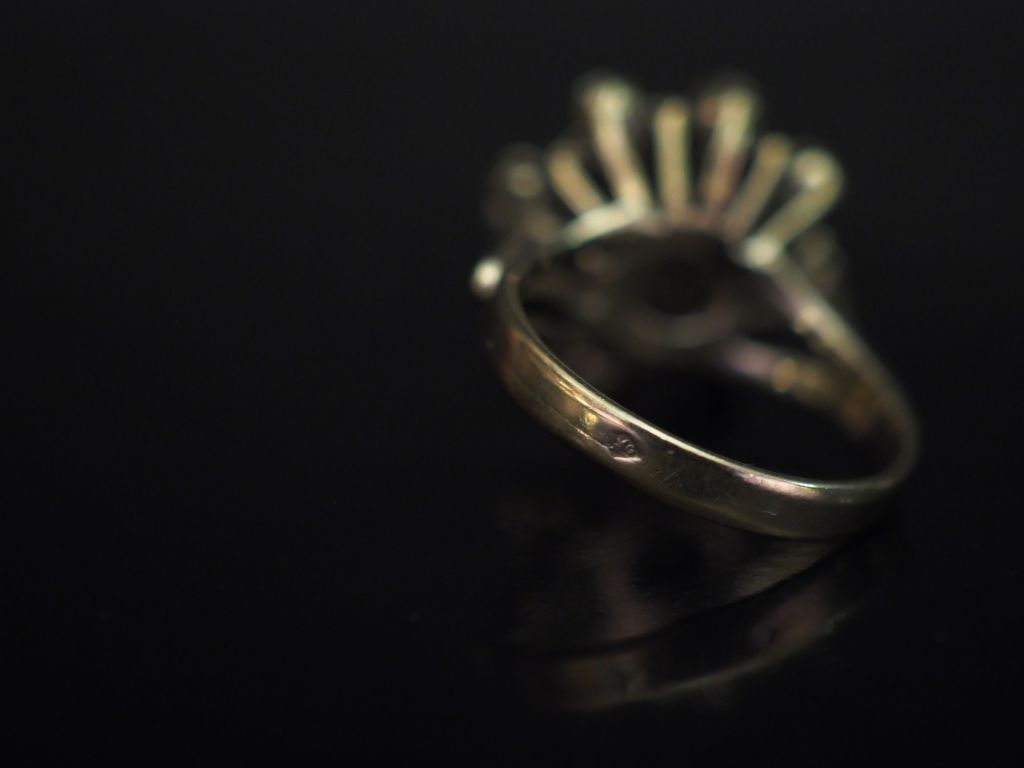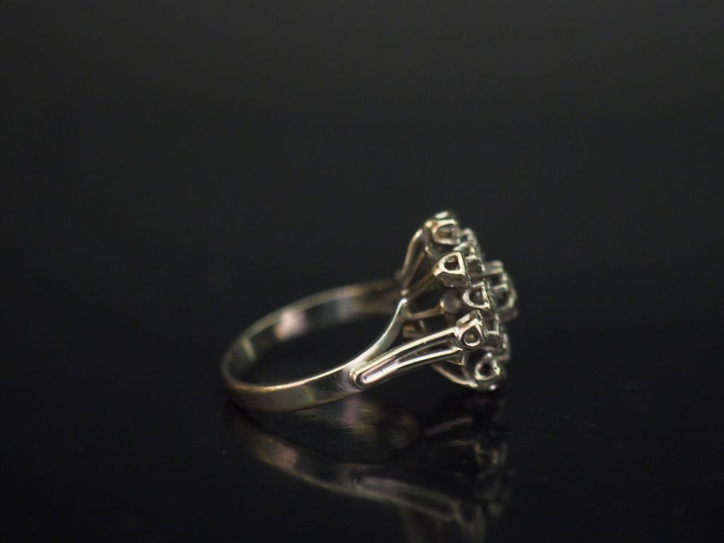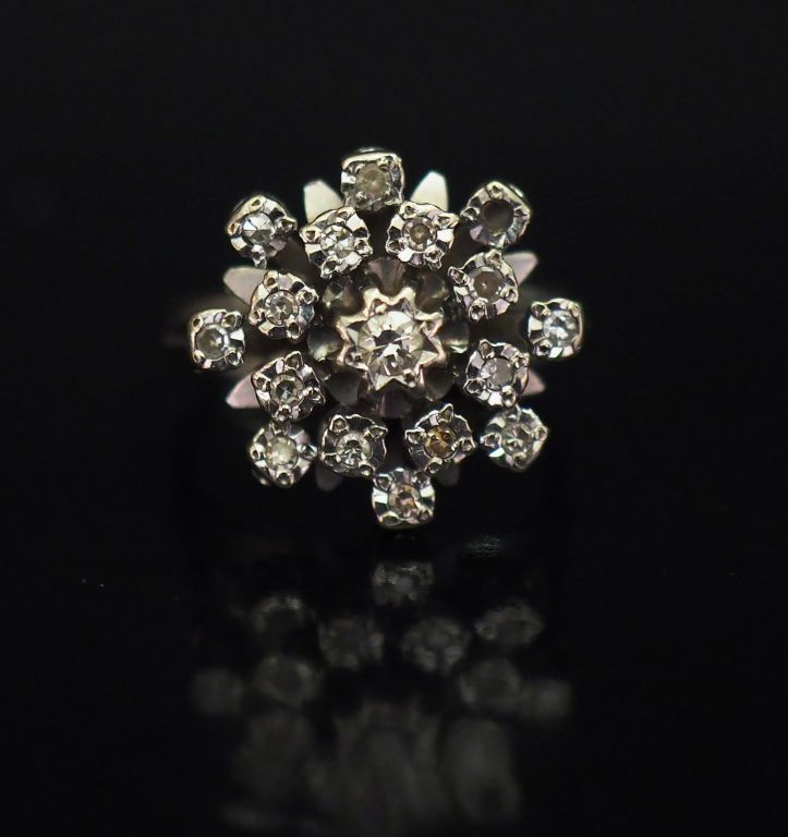 Bague en or blanc en forme de fleur épanouie, sertie d'un diamant central et de deux couronnes de petits éclats de diamant. TDD. 50 Poids tel. 5,23 g (manque un éclat)