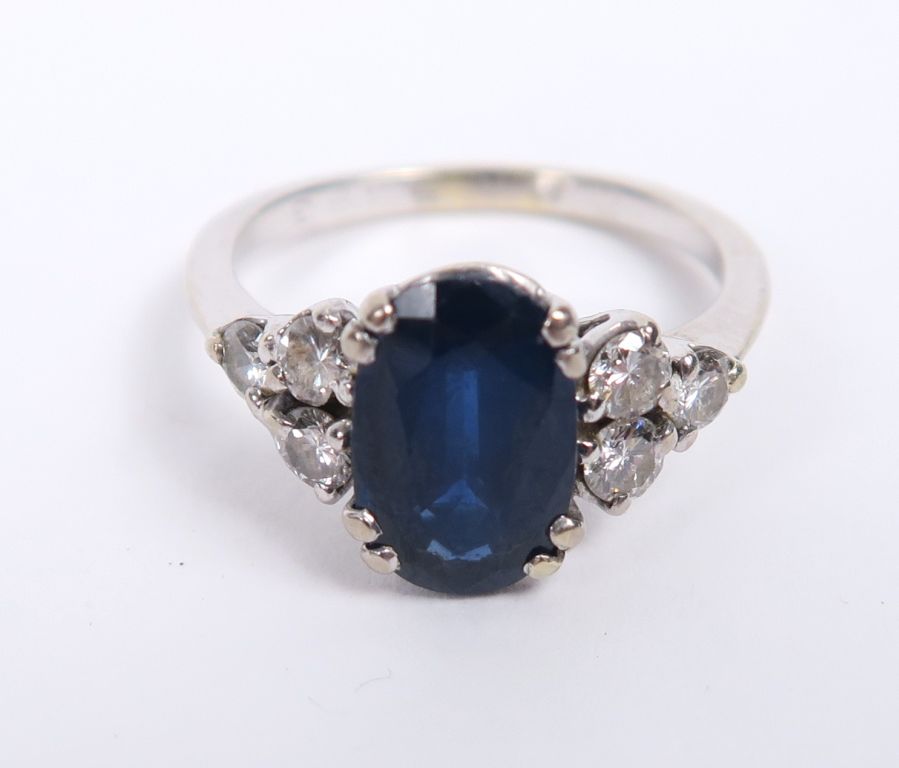 Bague en or blanc, ornée d'un saphir épaulé de trois diamants de chaque coté. Poids tel. 3 gr