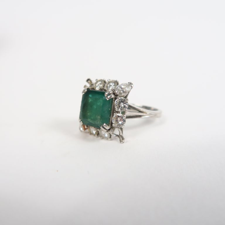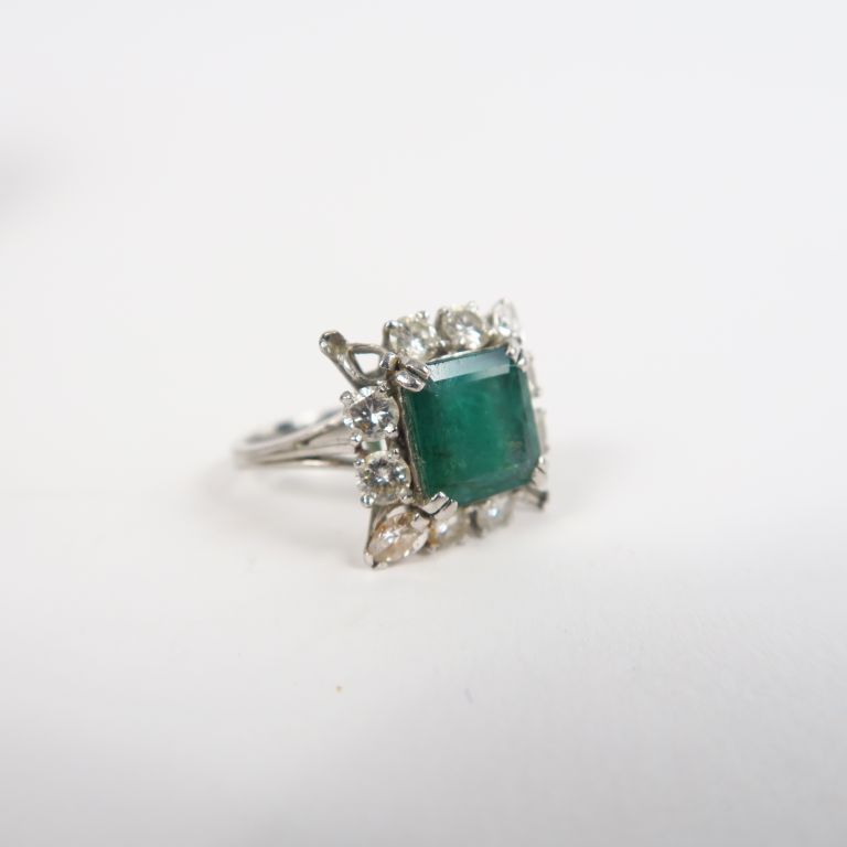 Bague en or blanc ornée d'une émeraude entourée de diamants. TDD. 55 gr Poids tel. 7,12 g (manque deux petits diamants)