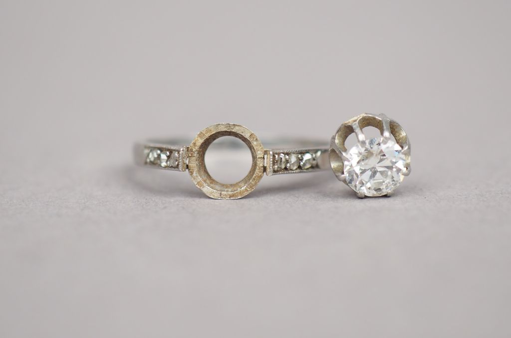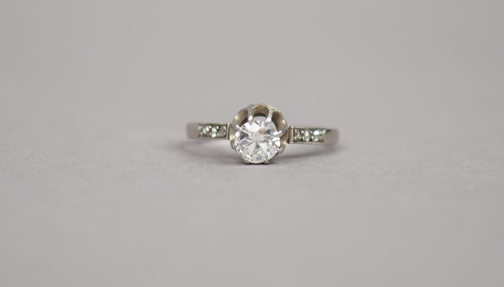 Bague en or blanc, ornée en son centre d'un solitaire d'environ 0,4 ct épaulé d'une ligne de trois petits diamants. TDD. 51 Poids tel. 2,66 g (accident, couronne supportant le diamant central à resouder)