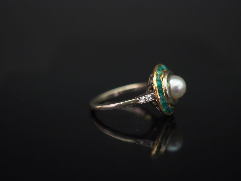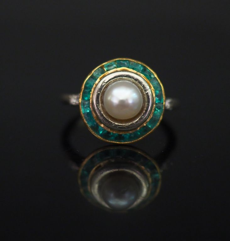 Bague en or blanc, sertie en son centre d'une perle blanche entourée d'une couronne d'émeraudes calibrées. La monture est sertie de quatre petits diamants. TDD. 46 Poids tel. 3,43 g (très légers accidents)