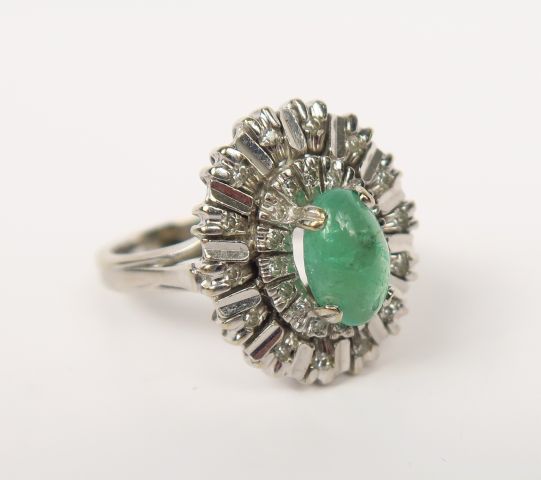Bague en or gris ornée d’un cabochon d’émeraude sur un décor rayonnant pavé de petits brillants. Poids tel : 9.1 g