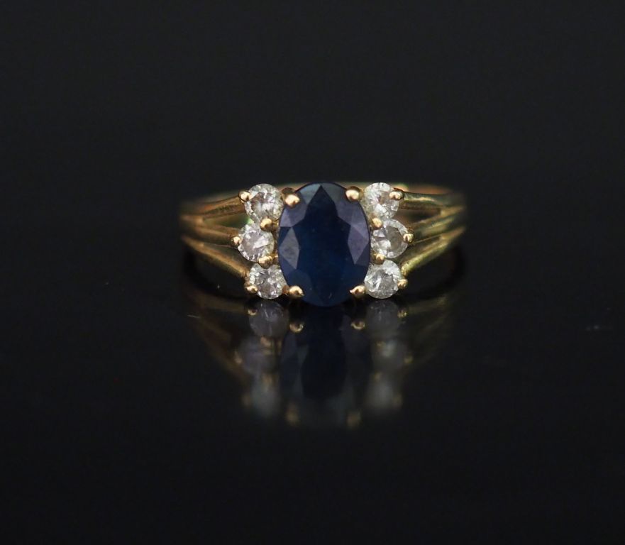 Bague en or jaune 14k, sertie en son centre d'une pierre bleue épaulée de six petits diamants. Jolie monture ajourée. TDD. 56 1/2 Poids tel. 2,81 g (anneau légèrement tordu)