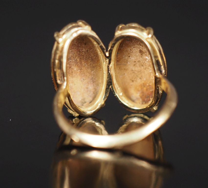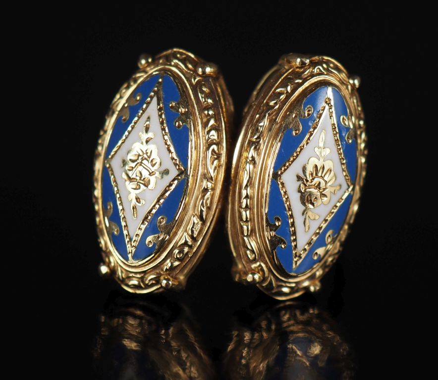 Bague en or jaune 750, composée de deux motifs ovales accolés, à décor de fleurs rehaussé d'émail bleu et blanc. TDD. 50 Poids tel. 5,05 g